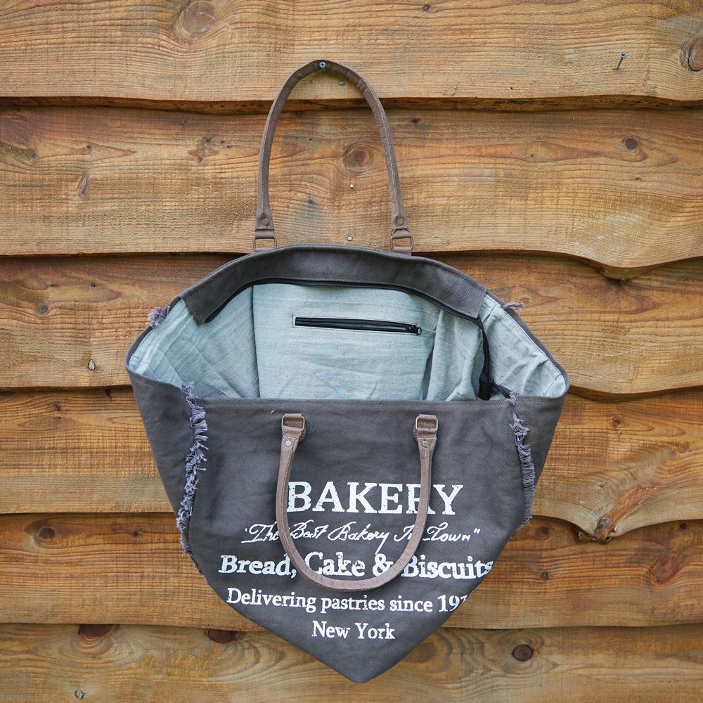There is nothing like the sweet smell of bread, cake, and biscuits! This canvas bag captures the essence of a New York Bakery. Item is made of canvas. Handle is 9''H.