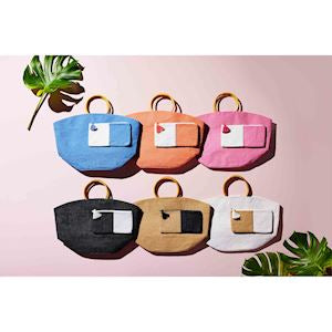 2-piece set. Jute tote features bamboo ring handles and laminated wipe-clean interior. Comes with color-block jute case with zipper tassel pull.