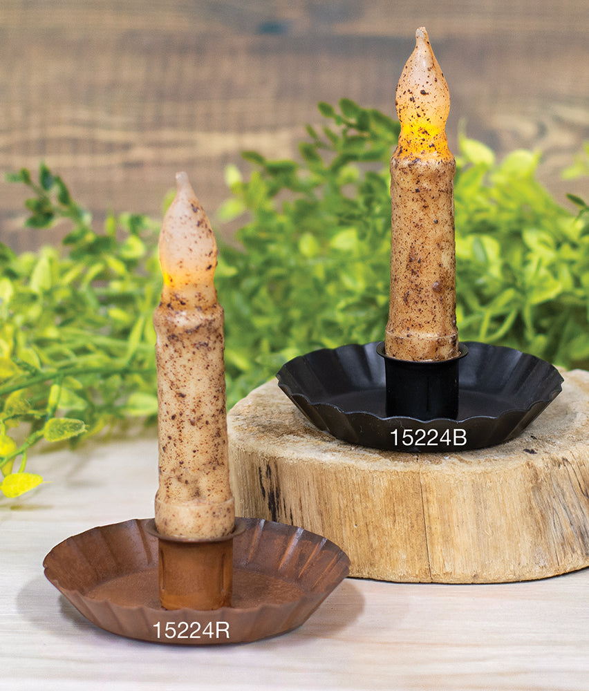 Our Fluted Taper Candle Holder has a rustic brown finish that is emphasized by the metal's grooved pattern. It will be a great addition to a display of country or antique-inspired decor. Measures 3.75" in diameter and is ideal for use with our timer tapers.