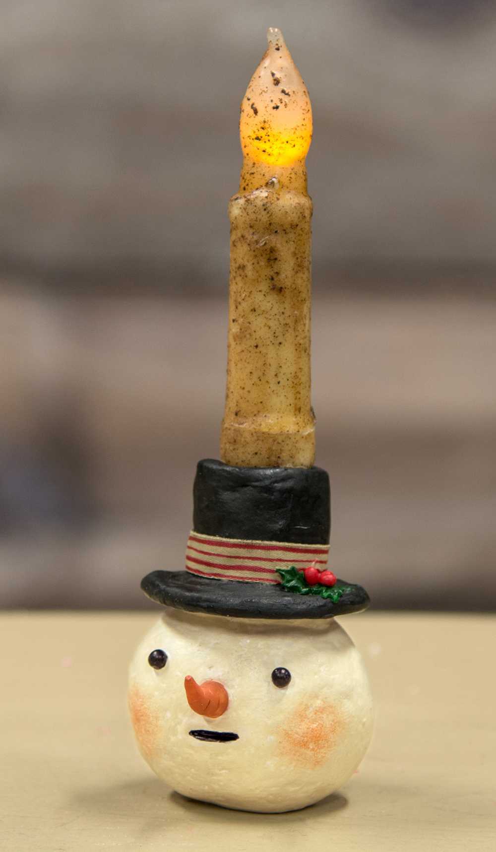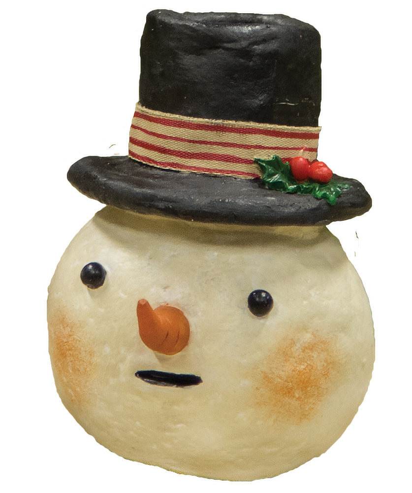 Our Snowman Taper Holder is made of resin which gives this holder a solid ceramic feel and weight. It's the shape of a snowman face, painted white with rosy red cheeks and a dimensional carrot nose. He is wearing a black top hat which serves as the taper holder that's adorned with a red and tan striped ribbon and holly leaves.