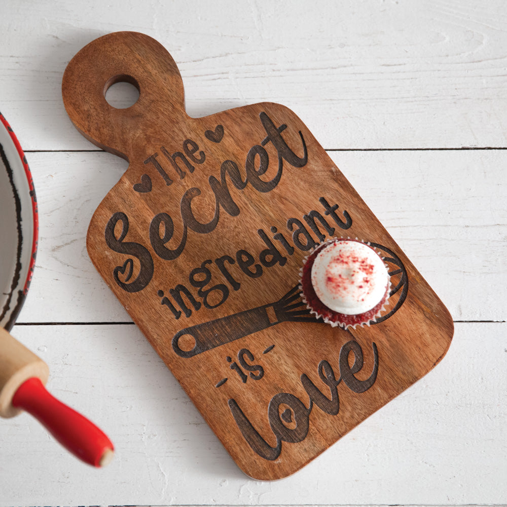 The secret ingredient is love, of course! It’s the perfect gift for Valentine's Day, but can also be displayed all year long! This cutting board is crafted from mango wood with wood-burned details. Item is food safe.