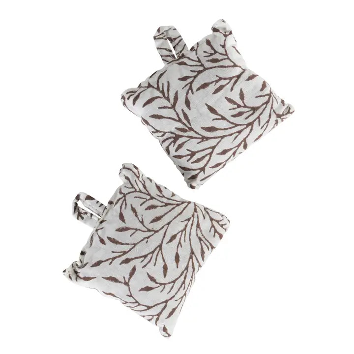 The calming scent of lavender with clarifying properties is beautifully contained in these handsewn lavender sachets. Tuck it in a drawer, a gym bag, in the car, or under a pillow to usher in a moment of sweet-scented peace. Handcrafted by artisans Materials: 100% cotton exterior, filled with 65% rice, 35% lavender - Measures: 3"L x 3"W x 0.3"D - Care: Keep in a cool, dry place. Dust off as needed. - Colors: Cream, light brown - Notes: Short hanging loop on each sachet - Handcrafted in India