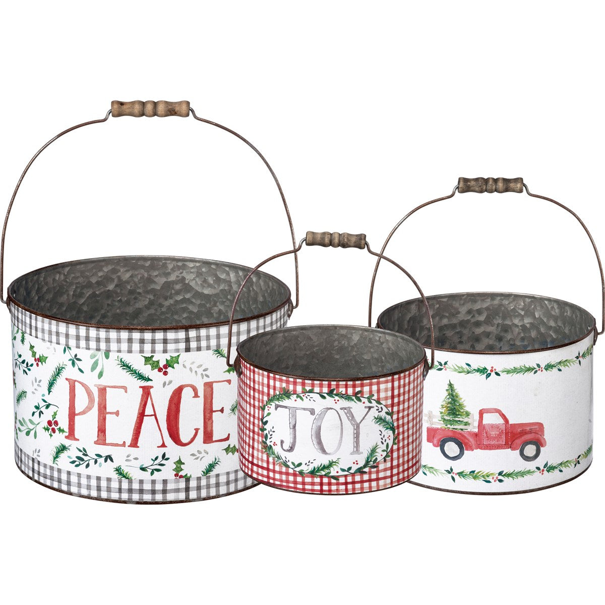 A charming holiday accent, a set of three buckets in varying sizes featuring watercolor artwork, hand lettered sentiments, and different designs and backgrounds on each that intermix perfectly. Contain top handles for easy carrying.