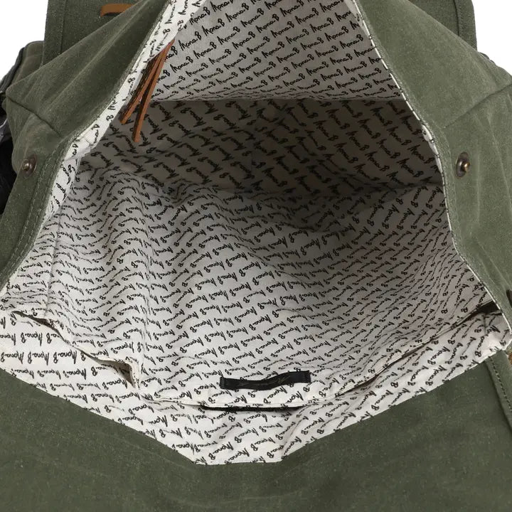 Material: Up-Cycled Canvas and Genuine Leather Trims Short Description: Made from durable re-milled and up-cycled military tarps & tents used by the army, covering trucks as tarps and providing shelter as tents, this textile given new life